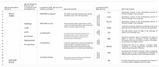 An assessment of the landscape quality of the CZNBg has to provide quantified data regarding spatiotemporal changes in the urban landscape’s structure. Over the last two decades, landscape metrics have been used extensively as quantitative expressions of changes in the urban landscape’s structure using specific indicators at the landscape and class levels [67,68,69,87]. Landscape metrics are algorithms that quantify the spatial characteristics of landscape elements, supporting landscape analysis by means of objective indices. In these terms, carefully chosen metrics and parameters belonging to different groups, such as patch density and size metrics (AREA_ha, CA%, NumP, PSSD), edge metrics (ED), shape (MSI and MPAR), and diversity metrics (SDI and SEI), provide valuable information for improving assessments of landscape modifications in different time periods [67,68,69] (Figure 6).
