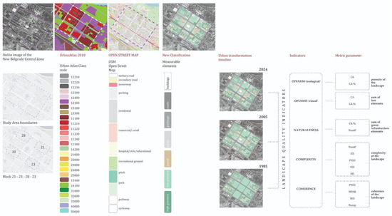 As a means of providing deeper and site-specific insights into the research topic, landscape quality assessment is employed here to further investigate and offer criteria for the assessment of MH spatial values from the perspective of the contemporary landscape architecture approach. It embraces measurable indicators of landscape values as a whole [43,44,45,46] with contemporary analytical tools. The basic foundation used to determine the landscape structure of CZNBg is rooted in the Urban Atlas of Land Cover created under the framework of the Copernicus programme of the European Union. The Urban Atlas database offered only partial information about the CZNBg landscape structure, prompting the need for the enhancement of land use/land cover (LU/LC) classes through integration with data sourced from OpenStreetMap (OSM). Using modern GIS technologies and remote sensing, the mapping of LU/LC classes provides important outputs for measuring urban landscape structures and applying landscape metrics to assess modifications at the landscape and class levels over different periods [67,68,69]. The detailed methodological review is closely related to the research results presented in Section 4.3.