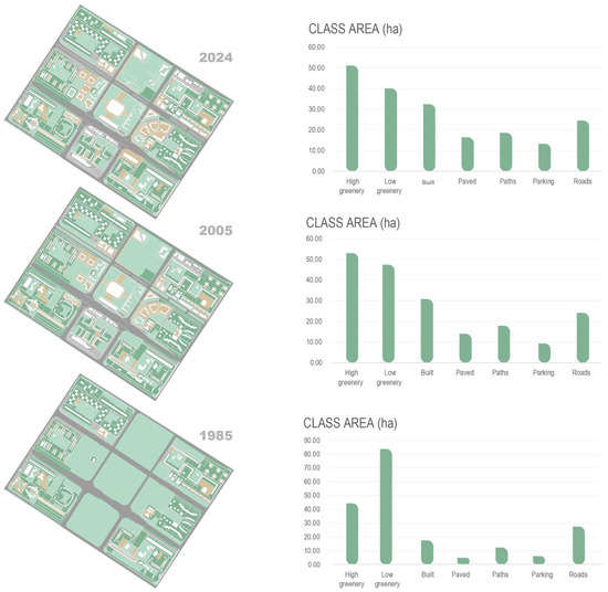 The ecological and visual openness metrics exhibited significant changes over time (Table 1). Ecological openness showed changes in the class values of high and low greenery between 1985 and 2005, with a decrease in porosity. However, from 2005 to 2024, this decrease slowed over the same period. Visual openness also showed notable variation in class values, such as low greenery, paths, paved areas, and roads, with a decrease between 1985 and 2005, whereas in the remaining period it stayed relatively stable, from 2005 to 2024.