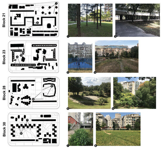 Openness as an indicator of the landscape quality of CZNBg is recognised within both Dobrović’s and Petričić’s works [73,78], and it is observed as open urban blocks within naturally occurring clusters of lush vegetation, with adaptable compositions that prioritise artistic expression over rigid geometric designs. The naturalness of CZNBg emphasises an organic approach to shaping nature, combining organic and inorganic elements into a functional structure. The role of greenery (high and low) plays a crucial role in maintaining a natural feel amid urbanisation, providing environmental protection (wind and sun protection, noise reduction, and enhancement of the microclimate). Furthermore, aesthetic factors, such as the colour, structure, and arrangement of vegetation, play pivotal roles. The complexity of landscape structure is noticeable within a diverse range of artistic compositions in both inner block greenery and larger inner block/park panoramas that emphasise vistas and offer diverse views, experiences, and uses for residents (roads, parking, pedestrian walkways, and waste collection points, as well as expansive green areas featuring playgrounds and sports grounds). Although dimensions and distances may change over time, the structure of the CZNBg ensures that human measurements remain consistent to maintain a comfortable and harmonious living environment. In contrast, the outer block design adopts a mixed composition along roads, incorporating diverse vegetation types. The design balance between functionality, aesthetics, and ecological benefits, such as noise and pollution reduction, whereas during the socialist period, urban green open spaces primarily served recreational purposes and represented a space for social gatherings. The coherence of the block structure strives for spatial harmony in composition, preserving the integrity of open areas in continuous spaces and ensuring that all building layouts contribute to a cohesive landscape.