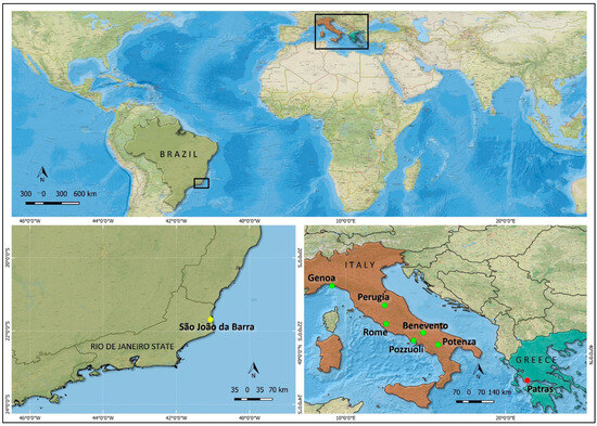 Location map of the selected case studies. (On the top), a global view of the countries involved; (below left), the 6 Italian cities selected all along the Italian peninsula: Genoa, Perugia, Rome, Pozzuoli, Benevento, and Potenza, and the Greek city—Patras; (below right), the city located in southern Brazil—São João da Barra.