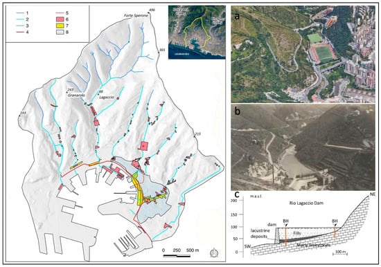 On the left, drainage network modifications and flood prone areas of the morphological amphitheater on which the historic center of Genoa lies. Legend: (1) poorly modified and/or natural riverbed; (2) culverted stream; (3) concrete channel; (4) eaves channel; (5) abandoned channel; (6) exposed buildings; (7) flooding area with returned period > 200 years; and (8) historical flooded area. On the right, the figures show the upper sector of the Lagaccio stream valley affected by relevant man-made morphological modifications: (a) the present-day situation, with the sports facilities on the fills along the stream; (b) the Lagaccio dam lake in the 1960s; and (c) geomorphological section (BH = boreholes).