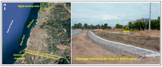 The Patras case study explores the interconnection between the geomorphology and urbanization of a coastal area, locating and analyzing the behavior and interactions of the landforms of the city. Generally, the city underwent fast and continuous expansion in the mid-1800s, which was further accelerated in 1960s. The city’s expansion resulted in the diversion of the river channels (Figure 5, left). Additionally, it led to the rivers and coastal areas being filled to create the city’s infrastructure. Since 1960, the erosional status of our coastal study area resulted in coastal retreat of up to 7.5 m (Figure 5, right). The coastal belt is an area in which the interaction between the marine and land areas is caused by biotic and abiotic components. Moreover, climate change alters the basic conditions under which shores evolve. In both cases, estimates of long-term or short-term displacement of the coastline are crucial to mitigate the negative impacts and protect the coastal structures from corrosion and other processes that alter the coastal stability. In our case, the coastal belt was exposed to storms from strongly bimodal winds from the northern to western directions.