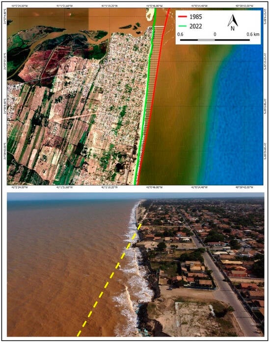 Satellite image of 1985 coastline overlapped with the current one, showing the areal gap due to erosion (modified from [69]). Below: coastal sector of the municipality of São João da Barra (Rio de Janeiro) consumed by coastal erosion. The yellow dotted line represents the past position of an avenue (N-S view) (Photo: Laboratory of Geomorphology UNICAMP collection, 2023).