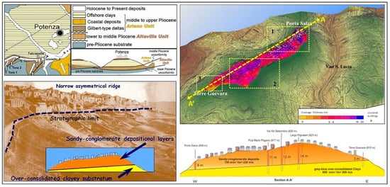 On the left: Geological-stratigraphic structure of the historic center of Potenza (modified from [71]). Below left is an old photo from 1857 (with evidence of the earthquake damage), which shows the asymmetric ridge on which Potenza stands and the entire non-urbanized southern side of which the original morphology can be observed. On the right: Geological schematic section and model along the main axis of the Potenza hilltop town (section A-A’, west–east direction), with evidence of the 3 main areas analyzed and the digital model of the top of the clay substrate.
