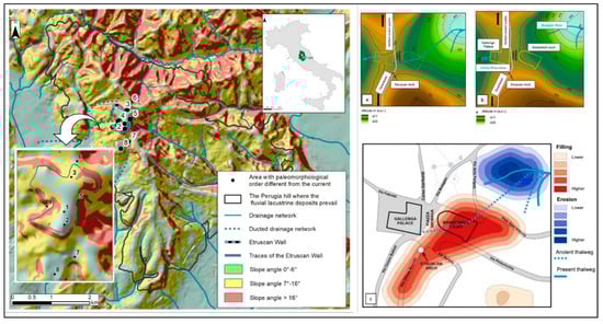Perugia, with a population of 167,000, is the capital city of the Umbria region. The historic city center is situated atop a hill with a maximum altitude of 493 m a.s.l. From its peak, five ridges branch out towards the south, overlooking the Tiber River valley, which is around 170 m a.s.l. Therefore, Perugia’s two main morphological elements are the ridgelines at the top and the fluvial valleys at the bottom. The hill’s eastern and southeastern area is characterized by three well-shaped ridges directed towards the north, northeast, and southeast. In contrast, the last two ridges, which point towards the southwest and west, are shorter and less defined. In general, the eastern side of the hill is steeper than the western side, where the morphology is gentler. The rivers that flow down also exhibit different behaviors. The rivers on the eastern and southeastern sectors are shorter, steeper, and far from the equilibrium condition. The headwaters are affected by gravitational and fluvial erosion, resulting in landslides and significant linear erosion along the thalwegs. The rivers that originally flowed along the western sector have been culverted over the centuries due to better morphological attitudes and are no longer visible. After the Second World War, this city area experienced the greatest expansion of its building fabric and infrastructure. Although the fluvial valleys are no longer present, the morphology of the areas close to the historic city center resembles that of a drainage basin. During the most important past civilizations that modified the urbanization of the downtown area (Etruscan: 6th–3rd century BC and in the Middle Ages) the headwaters of the main rivers and the thalwegs have been the sites where the morphology has been deeply changed [75,76]. The two primary changes made by humans were filling in the depressions where erosion occurred and leveling the tops of the reliefs. Some of the most iconic places in the historic center of Perugia are therefore forms of “morphological false”. Geomorphological surveying can recreate the initial topographic assessment and reconstruct the most significant phases of the morphological evolution of the hill.