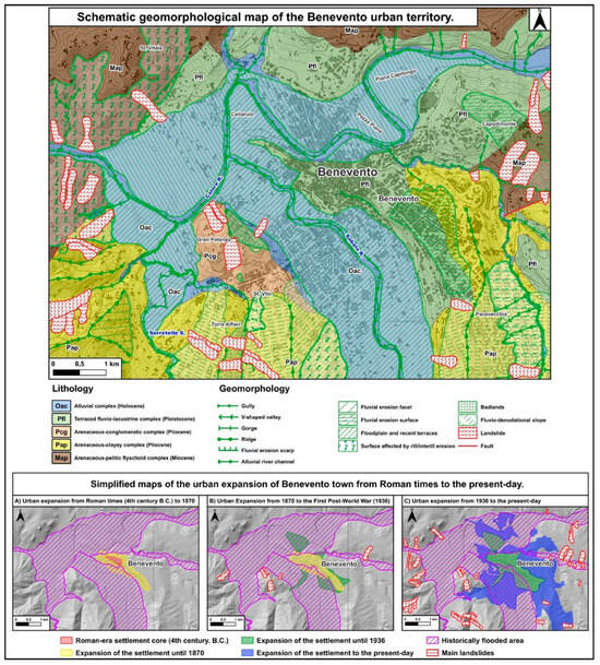 (Upper box)—Schematic geomorphological map of the Benevento urban territory. (Lower box)—Simplified maps of the urban expansion of Benevento town from Roman times to the present-day.