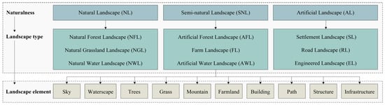 We employed a multi-tiered method of classifying rural landscapes based on international land use standards and relevant research [57] that has categorized rural landscapes by level of ecological naturalness (visual indicators: greenness, water bodies) into natural, semi-natural, and artificial landscapes.