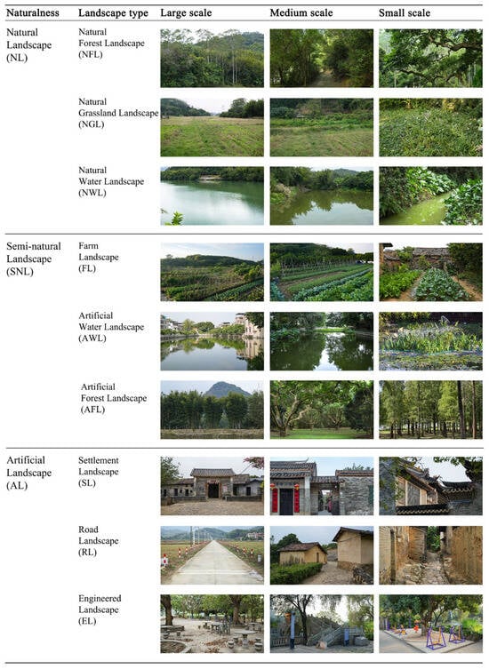 - Natural Landscapes (NLs) are pristine and minimally disturbed landscapes featuring a variety of animal species, colors, and vegetation [22]. In rural areas of Guangzhou, these primarily include natural water landscapes (NWLs), natural forest landscapes (NFLs), and natural grassland landscapes (NGL) [18,36,61].