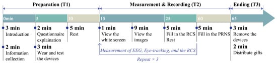 The researchers first described the standard procedures of the experiment to the participants, acquainted them with the experimental equipment, and informed them of their rights before asking them to sign the informed consent form. After giving their consent to participate, the participants reported their age, gender, educational level, and permanent residence in the background survey questionnaire (Table 1). We then explained the RCS and PRNS and helped the participants properly put on and test the EEG and eye-tracking devices. The participants were then led to a computer displaying images and were informed that they could freely view the scenes during the experiment but must avoid significant head movements. After a five-minute break, each participant was randomly assigned a sequence of images of equal naturalness and three different landscape types. The image slideshow included a minute of blank screen followed by 9 min of images (each image lasted 15 s, with each landscape type displayed for 3 min). Before playing each landscape type, a white screen with text prompts was displayed for 3 s. The EEG and eye movement data were continuously recorded during the experiment. After viewing the slides, participants were given a short period to reflect on the differences among the three types of landscapes under the same level of naturalness. They then filled out the RCS for each landscape type, guided by corresponding sample images provided in the PRNS. This method not only enabled participants to conduct a more comprehensive comparison among three levels of naturalness and three types of landscapes within the same naturalness level but also ensured the accuracy and reliability of the collected data. After filling out the RCS, participants took a five-minute break and then repeated the process twice more with slides of two other levels of naturalness. Upon the final round of slides, the participants completed the PRNS. The entire experiment lasted approximately 60 min per participant (Figure 5).