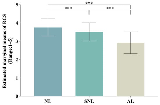 The RCS results indicated significant differences in perceived restorativeness among the three levels of naturalness of the landscapes (Figure 6, Table A3), with natural landscapes (3.758 ± 0.472) having the highest perceived restorativeness, followed by semi-natural landscapes (3.516 ± 0.497), and then artificial landscapes (2.923 ± 0.598), F (1.671, 165.429) = 107.046, p < 0.001. Further LSD post hoc tests revealed that the restorativeness of the natural landscapes was significantly greater than that of the semi-natural landscapes (MNL-MSNL = 0.242, p < 0.001) and the artificial landscapes (MNL-MAL = 0.835, p < 0.001); likewise, the restorativeness of the semi-natural landscapes was significantly greater than that of the artificial landscapes (MSNL-MAL = 0.593, p < 0.001).