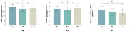 The results of analyzing the RCS scores for the rural landscape types with different levels of naturalness are shown in Figure 7 (Table A4). Significant differences were observed in the RCS scores among the three natural landscape types, with restorativeness scores ranked from highest to lowest as follows: natural forest landscapes (3.940 ± 0.542), natural water landscapes (3.784 ± 0.622), and natural grassland landscapes (3.550 ± 0.566), F (1.872, 185.340) = 23.127, p < 0.001. The LSD post hoc tests showed a significant difference between natural forest and natural water landscapes (MNFL-MNWL = 0.156, p = 0.002 < 0.01); natural forest landscapes had significantly higher scores than natural grassland landscapes (MNFL-MNGL = 0.390, p < 0.001) and natural water landscapes had significantly higher scores than grassland landscapes (MNWL-MNGL = 0.234, p ≤ 0.001).