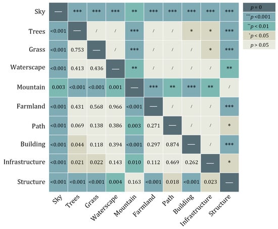 Image datasets such as Cityscapes, ADE20K, and SUN Database include detailed pixel-level annotations and they are, thus, widely used for the detection, classification, and segmentation of scenes to accurately determine the specific categories of each element in the images. In this study, we selected a semantic segmentation model pre-trained on the ADE20K dataset to perform semantic segmentation on experimental images. ADE20K offers 150 detailed categories of scene images [67], providing a broader selection of landscape element types than datasets such as Cityscapes. This enhances a model’s accuracy and generalization capabilities, enabling high-quality image segmentation and the analysis of diverse and complex scenes [68,69]. To meet the requirements of this study, we adjusted the categorization model and finalized 10 landscape element categories: sky, waterscape, trees, grass, farmland, mountain, building, path, infrastructure, and structure. Of these, infrastructure is generally defined as the tangible constructions and assets that provide essential services to society, such as bridges and dams; meanwhile, structures refer to man-made buildings that do not possess, contain, or provide human habitation functions, such as towers and pavilions [70].