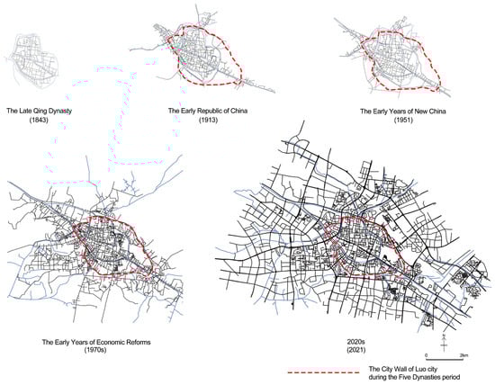 This study aimed to delineate the evolutionary history of the urban spatial context of Changzhou Canal, employing a principle that transforms intricate and continuous changes into distinct historical periods, thereby exhibiting the characteristics of stages and dynamics. Considering the city’s evolutionary traits across different historical epochs, as well as factors such as map data acquisition and cartographic precision, this study focused on five key temporal junctures for spatial syntactic analysis: 1843 (Qing Dynasty’s Daoguang era), 1913 (early Republic of China), 1951 (early founding of the People’s Republic of China), 1970s (early economic reforms), and 2021 (2020s). The five maps were vectorized and georeferenced using ArcGIS 10.5 [37] (Figure 4). Subsequently, the river and street network maps from each period were imported into Depthmap+ Beta 1.0 software for syntactic parameter analysis, the establishment of a topology dataset, and the quantitative analysis of the foreground and background networks utilizing the Normalized Angular Integration, the Normalized Angular Choice, and the Metric Mean Depth tools. The relevant data sources are detailed in Table 1.