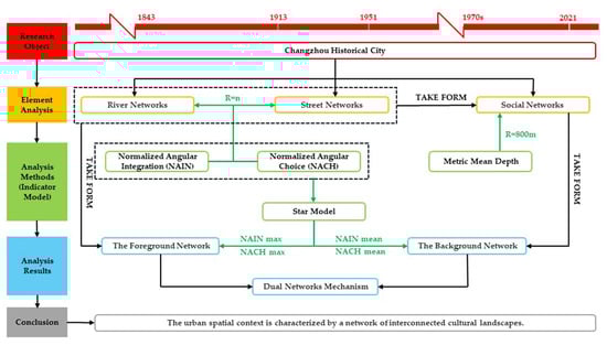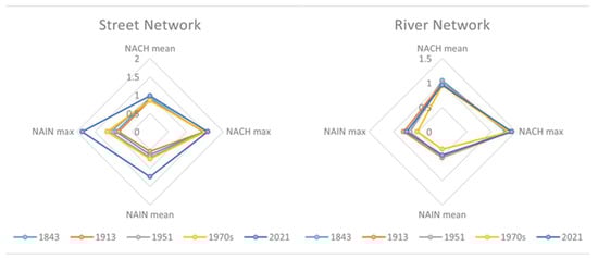 Moreover, the study utilized the “star model” [33,34] of urban morphology to compare the river and street networks across five distinct periods. It further examined the driving forces behind the formation of cultural landscapes, primarily encompassing microeconomic activities and social–cultural dynamics, as well as spatial configuration patterns from a global-to-local and local-to-global perspective. The study utilized the average NAIN value as a metric for assessing the propensity of activity types within both foreground and background networks, while the NACH score (NACH max/ NACH mean) served to elucidate spatial configuration patterns [35,36].