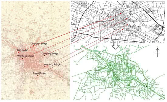 The description and explication of this cultural landscape feature and its interrelationships have been the focus of ongoing scholarly inquiry. Currently, scholars have recognized that critical humanistic information hidden in space can be interpreted and expressed through digital patterns [12,13,14,15], while also investigating prospective avenues of inquiry utilizing the framework of spatial syntax theory. Spatial syntax takes space as the subject of research, borrowing the topological segmentation model as a quantitative method that can provide a structural and intuitive description of elemental relationships [16], aiming to interpret the relationship between urban space and the spatial organization of human social cognition, socio-economic and cultural phenomena, and spatial grouping [16]. Relevant studies conducted by both Chinese and international scholars have demonstrated that the topological structure and organizational rules of street networks play a crucial role in shaping and disseminating the urban spatial context. The evolutionary characteristics of the distribution and hierarchical structure of commercial districts in the ancient Beijing city area were validated through an analysis of street networks [17]. This revealed the historical evolution of the relationship between the water system and gardens in Suzhou city from the 13th to 20th century through the application of spatial syntax methods to urban waterway transportation [18]. By integrating the historical geography method and the histogram method, the empirical study in the Famagusta region proved the close relationship between land use and socio-economic activities directly, reflecting the process of change in the physical and social space of the city [19]. The use of spatial syntax theories and methods allows for the examination of socio-cultural dimensions embedded in historically significant spatial systems [20,21]. Current research tends to focus on exploring the distribution characteristics of water systems or street spaces and certain types of cultural forms based on syntactic indicators, such as integration and choice degree. However, there is still insufficient research on the comprehensive features and interrelationships of urban spatial legacies in terms of their spatial forms.