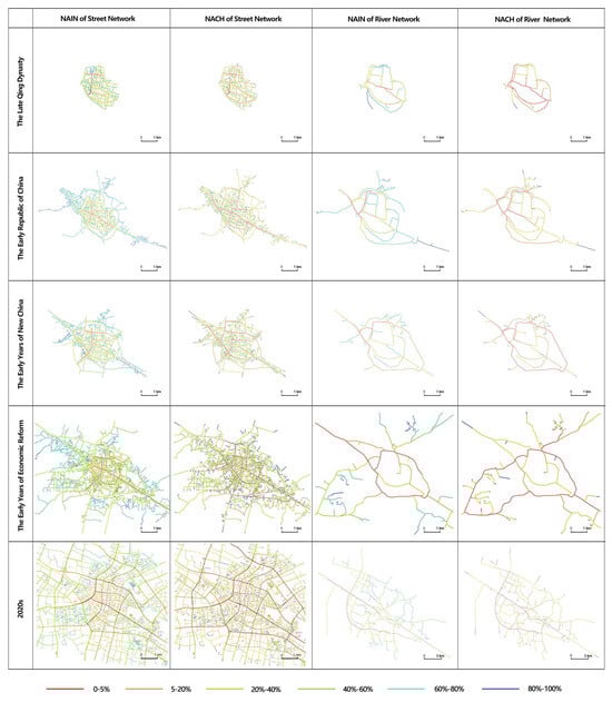 The analysis of the foreground network is illustrated in Figure 5. (1) The NAIN core value of the street network shows that the structural skeleton of the urban space expands symmetrically to the north and south, and the centrality of the east–west transverse axes decreases significantly. The traditional longitudinal axis forms a cross with Xiyingli Commercial Street to the south, while the East and West Heng streets perpendicular to it to the north show high accessibility characteristics again and establish better connectivity with the suburbs. (2) The river network NAIN and the street network NACH show that both the river and street networks of the canal in the western part of the city have good accessibility, providing spatial structural evidence of the coexistence of wheeled and land transportation in that period. The river network NACH shows a significant decrease in choice degree, since local rivers in the city have become blocked or partially filled. The dominant patterns of both the east–west river and street networks have disappeared compared to previous periods.