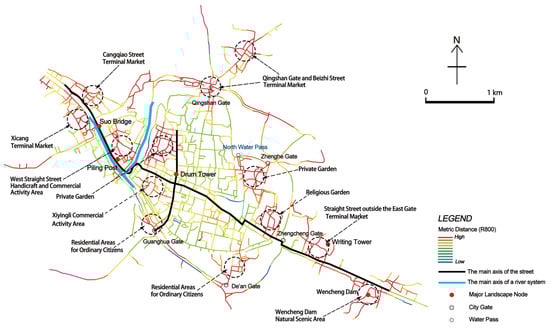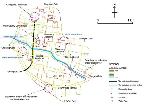 The foreground network analysis is shown in Figure 5: (1) The foreground network is constituted by the core collaboration of streets and rivers. The NAIN core value of the street network points to “Fuzhi Street” and “South Street” leading to Guanghua Gate in front of “Changzhou Mansion”, while the core value of the river network NAIN is displayed along the south moat of the outer city and Gutang River (the Back River), both of which together constitute the core spatial structure of the city. (2) Numerous structures symbolizing ritual thoughts, and the Memorial archway, are installed on both sides of the Core Integration Degree Street (Fuzhi Street). Important cultural landmarks are located symmetrically on both sides of the core river: the county school and the county Chenghuang Temple, Wenchang Pavilion and Lu Garden, Longcheng Academy, and Yanling Academy, and the Drum Tower is located at the intersection of the two core networks. Historical maps clearly show multiple-step patterns along the core river, indicating a strong interaction between residential life and the river. (3) The NACH model of the river network shows the dominance of the canal system for transportation and traffic in the city during this period, and the network of the canal system, as an important basis for dividing neighborhoods, has a significant impact on the spatial configuration of the city. The background network analysis is shown in Figure 6: the city gate effect is significant. In the background network analysis, the patchwork partition formed at the metric distance R = 800 m had some correspondence with transportation nodes, such as city gates and water gates (Figure 6).