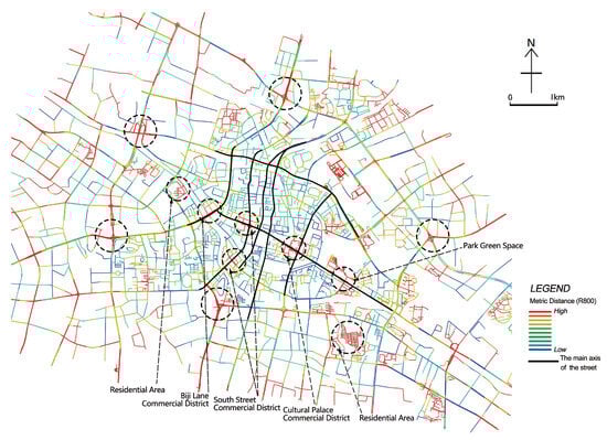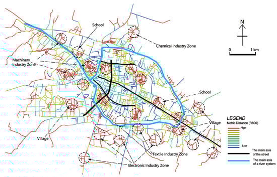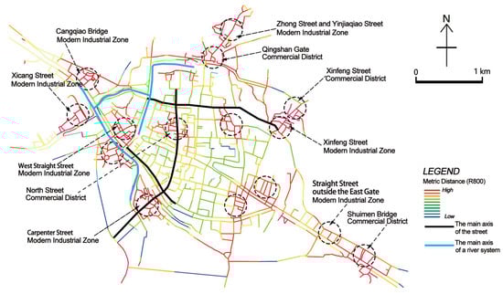 In the context of background network analysis, the Metric Mean Depth identified the main business districts and recent industrial areas clustered in the street network, which were well connected to the high choice degree streets shown by the NACH model of the street network, but discrete from the highly integrated streets shown by the foreground network (Figure 8). During this period, due to the development of modern industry, the urban land area was gradually expanded, showing the characteristics of outward expansion along rivers and roads, and the center of the urban structure was gradually and slowly moved to the south [40]. Modern factories and enterprises have chosen their locations along convenient transportation routes, and the layout was relatively messy, resulting in the crisscrossing of industrial areas and living quarters in the city.