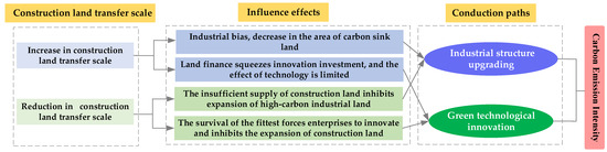 Construction land transfer scale reduces carbon emission intensity by influencing industrial structure upgrading. The smaller the construction land scale, the higher the degree of industrial structure upgrading, and the lower the carbon emission intensity.