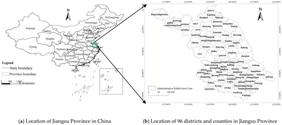 Jiangsu Province, situated along the eastern coast of mainland China, spans between 116°18′ E and 121°57′ E (Figure 1). It comprises 13 cities and 96 districts and counties. With a total area of 1.072 × 106 km2, construction land occupies 1.832 × 105 km2, constituting 17.16% of the total area. Endowed with superior natural conditions, Jiangsu Province features low and flat terrain, a vertical and horizontal transportation network, convenient water and land transportation, and a thriving socio-economic landscape. With top-ranking indicators such as population density, per capita GDP, comprehensive competitiveness, and urbanization rate nationwide, the province contributes over 10% to the national economic growth, with the manufacturing industry constituting approximately one-eighth of its economic output. The province has progressed into the late stage of industrialization [35,44]. The output value of high-energy-consuming industries constitutes approximately one-third of the total industrial output value [45]. It is also the region with the largest carbon emissions in China [35]. In recent years, Jiangsu has placed considerable emphasis on the development of low-carbon cities. Notably, Nanjing City, Changzhou City, Huai’an City, and Zhenjiang City have been rated as national low-carbon city pilot cities. Jiangsu Province has set ambitious goals to ensure that carbon emissions peak by 2030, surpassing the national target by the end of the 14th Five-Year Plan. However, the province faces significant challenges due to its substantial energy consumption, leading to continuous increases in carbon emissions. It is crucial to explore the causal relation between construction land and carbon emissions in Jiangsu Province.