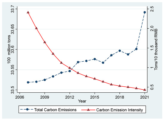 Total carbon emissions and carbon emission intensity of Jiangsu Province from 2007 to 2021.