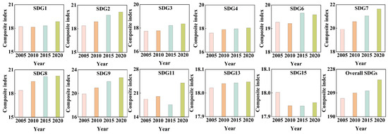 From 2005 to 2020, Ganzhou exhibited different evolutionary characteristics in achieving various SDG targets (Figure 2). The SDG 1 (No Poverty) index showed a slight decline from 2005 to 2010, followed by a gradual increase from 2010 to 2020. The SDG 2 (Zero Hunger) index displayed a yearly increasing trend from 2005 to 2020. The SDG 3 (Good Health and Well-being) index generally increased year by year, with a significant acceleration in growth observed from 2010 to 2015. The SDG 4 (Quality Education) index hit a turning point in 2010, after which the rate of increase slowed down. The SDG 6 (Clean Water and Sanitation) index experienced a slight decline from 2005 to 2010, followed by a significant rise, and then a minor decline again from 2015 to 2020. The indices for SDG 7 (Affordable and Clean Energy), SDG 8 (Decent Work and Economic Growth), and SDG 9 (Industry, Innovation, and Infrastructure) all showed steady yearly increases from 2005 to 2020. The SDG 11 (Sustainable Cities and Communities) index first increased and then decreased from 2005 to 2015 but continued to rise until 2020. The SDG 13 (Climate Action) index increased year by year. The SDG 15 (Life on Land) index experienced a notable decline from 2005 to 2010, followed by a modest increase from 2010 to 2020. Ganzhou has shown a year-on-year increase in overall SDG achievements.