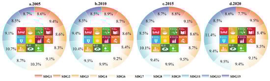 From 2005 to 2020, overall, Ganzhou showed relatively balanced development across various SDG targets (Figure 3). Overall, SDG 9 (9.4%~10.7%) and SDG 7 (9.4%~10.3%) had the highest development ratios. The development ratios for SDG 4 (8.3%~8.7%), SDG 13 (8.5%~8.7%), and SDG 15 (8.4%~8.7%) were relatively lower. From 2005 to 2020, the proportions of SDG 2, SDG 4, SDG 8, and SDG 11 in the development of all targets showed an increasing trend. Conversely, the proportions of SDG 1, SDG 7, and SDG 9 in the development of all targets during the study period showed a decreasing trend.