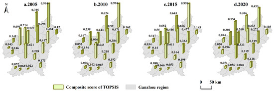 The overall SDG comprehensive evaluation index in Ganzhou exhibits a spatial-temporal differentiation characteristic of being higher in the north and lower in the south (Figure 4). The districts and counties with the highest SDG comprehensive index values are located in the northern part of Ganzhou, with values ranging from 0.3 to 0.998. The lowest SDG comprehensive index values are mainly concentrated in the southern part of Ganzhou, with values ranging from 0.022 to 0.096. From 2005 to 2020, the SDG comprehensive evaluation index showed varying degrees of decline in both the southern and northern parts of Ganzhou. There was an upward trend in the western part of central Ganzhou.