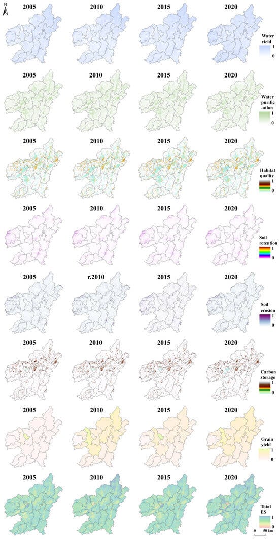 The overall ecosystem services index in Ganzhou shows high values in the southern and northern parts, with low values in the central region from 2005 to 2020. There are a few low-value clusters in the central-western area, and the aggregation of these low values expanded. The water yield index displays a distribution characteristic of being higher in the north and lower in the south (Figure 5). The water purification index is relatively higher in the western and north-central regions of Ganzhou. The habitat quality index presents spatial heterogeneity, being higher in the central and northern parts and lower in the south. The soil retention index is higher in the eastern part of Ganzhou compared to the west, though it is generally low across the board. The soil erosion index reveals a pattern of being lower in the city center and higher in the surrounding areas. The carbon storage index is generally high, with a few low-value areas concentrated in the central-western region. The grain yield index is overall higher in the central-western parts, showing a trend of initial increase.