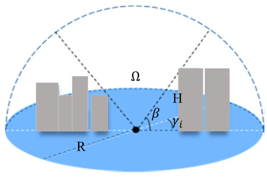 SVF is the ratio of the visible sky extent in the open space enclosed by a building and it is a common parameter used to describe the spatial characteristics of buildings (Figure 2) [48]. The SVF is one of the important factors affecting the UHI, and scholars have studied the correlation between the SVF and the thermal environment [49,50]. The value of SVF ranges from 0 to 1, with 0 indicating that the upward space of the observation point is completely shaded and 1 indicating that it is completely open and unshaded. Our study explored the relationships between the SVF of buildings and the UNHI/UNCI.