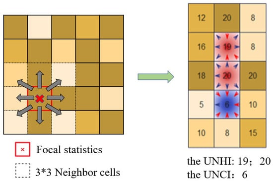 We can calculate Δi as the difference between the mean value of LST () and its neighboring cell value. If Δi is greater than 0, it is the UNHI. If Δi is less than 0, it is the UNCI.