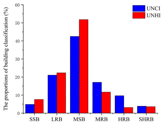 The proportions of building classification in the UNHI and UNCI were counted (Figure 5). The proportions of the MRB, HRB, and SHRB in the UNCI were higher than those in the UNHI, while the SSB, LSB, and MRB were the opposite. Among them, MSB accounted for the largest proportion, which was the main building type in the city. With the increase in building height, the difference between UNHI and UNCI of SSB, LRB, and MSB gradually increased. The difference between UNCI and UNHI of MRB, HRB, and SHRB decreased. Within a certain range, the neighborhood LST had a significant lowering effect as the building height increased.