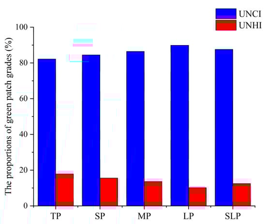 Figure 7 showed the proportions of different green patch grades in the UNHI and the UNCI. With the increase in the green space patch area, the proportions of the UNCI increased gradually. The proportions of the UNCI of TP, SP, MP, and LP were 82.16%, 84.45%, 86.43%, and 89.88%, respectively. The percentage of SLP was 87.54%, which was slightly lower than that of LP but higher than MP.
