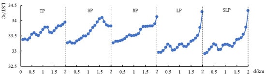 With the increase in the green patch area, its cooling effect was gradually enhanced (Figure 8). However, whether the patch area was large or small, this cooling effect decreased with the increase in the buffer distance. Within a 2 km buffer distance, the maximum difference in the temperature drop amplitude of TP, SP, MP, large patches, and SLP was 0.55 °C, 0.56 °C, 0.86 °C, 1.34 °C, and 1.42 °C, respectively. Green patches not only had a significant cooling effect on the interior but also a more obvious cooling effect on the surrounding environment. The fitting results of the distance decay model (Table 4) showed that with the increase in the patch area, the greater the cooling amplitude, the greater the influence distance. The cooling ranges of the MP, LP, and SLP were greater than 1 °C. The SLP was the largest, reaching 3.45 °C. The cooling distances of the SP, MP, LP, and SLP were more than 1 km. The SLP was the largest, reaching 2.25 km.