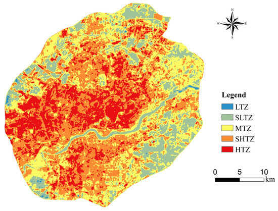 The distribution of urban thermal landscapes. HTZ: high-temperature zone; SHTZ: sub-high-temperature zone; MTZ: medium-temperature zone; SLTZ: sub-low-temperature zone; LTZ: low-temperature zone.