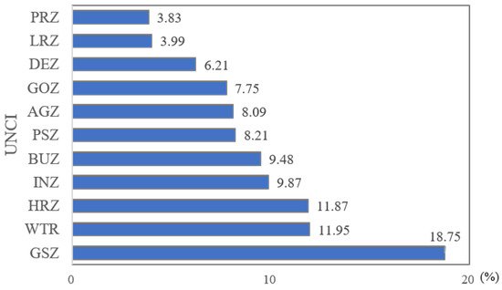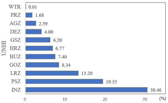 The effects of UFZ classification on the UNHI/UNCI were complex, and the study of multi-factor interaction was the key to further understanding the mechanism of the urban thermal environment. The results showed that the relative importance of different UFZ classifications varied in the UNHI and the UNCI. For the UNHI (Figure 10), the INZ was the largest influencing factor (30.46%), followed by the PSZ (19.35%), and the combined contribution of the two factors was nearly half of the total contributions. The influencing factors included the LRZ (13.20%), GOZ (8.34%), BUZ (7.40%), HRZ (6.77%), and DEZ (4.00%). The smallest contributions were made by the AGZ (2.59%) and PRZ (1.68%). For the UNCI (Figure 11), the GSZ had the highest impact (18.75%), followed by the WTR (11.95%), HRZ (11.87%), and INZ (9.87%), respectively. The contribution rate of the top four factors exceeded 50% of the total rate. The next most influential factors were the BUZ (9.48%), PSZ (8.20%), AGZ (8.09%), GOZ (7.75%), DEZ (6.21%), LRZ (3.99%), and PRZ (3.83%). In general, there was a small difference in the contribution of the factors influencing the UNCI.