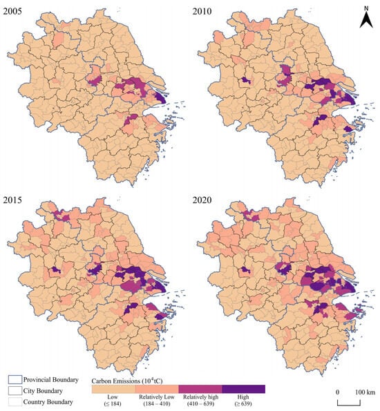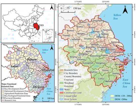 - Zhou, X.; Li, L.; Liang, Y.; Yang, L. Spatiotemporal evolution of territorial spatial patterns and carbon emissions in the Yangtze River Delta from the perspective of main functional zones. Trans. Chin. Soc. Agric. Eng. 2023, 39, 236–244. [Google Scholar]