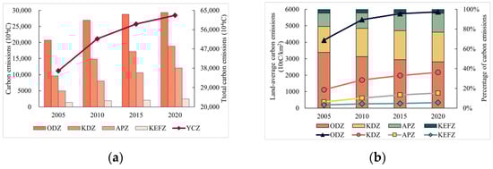 - High Carbon Control Zones. The high carbon control zones consist of 87 county units, accounting for 31.43% of the YRD’s land area, generating 48.99% of the YRD’s GDP, and 54.15% of the YRD’s carbon emissions. These zones are located mainly in the eastern part of Shanghai, the southern part of Jiangsu, the Ningbo-Hangzhou line in Zhejiang, and surrounding the central urban areas of some cities in Anhui, which are the most important area of the YRD region in terms of carbon emissions. Among them, the high carbon control zone-optimised development zones include 32 county units, which are the concentrated distribution areas of the manufacturing industry, and account for 30.14% of the YRD region’s carbon emissions. The ECC (1.01) of this kind of zone is less than that of other optimised development zones, as is the ESC (0.27), indicating that the economic benefits of carbon emissions and the ecological support capacity of these zones are at relatively low levels. The high carbon control zone-key development zones include 34 county units, which are the current key areas for industrialisation and urbanisation development in the YRD region. The ECC (0.84) and ESC (0.76) of this type of zone are lower than those of the YRD region, which shows that the high carbon emissions in these zones do not bring about a better economic benefit and have a low ecological support capacity for carbon emissions. The high carbon control zone-agricultural production zone includes 21 county units, which are more disturbed by human activities, and the economic efficiency and ecological support capacity of carbon emissions of these zones are lower than those of other agricultural production zones.