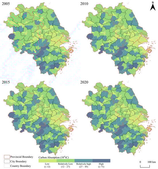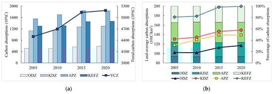 - In 2005–2020, the YRD region’s carbon emissions and carbon absorption continued to increase, but the rise in carbon absorption did not offset the rise in carbon emissions. Consequently, the regional carbon imbalance will become increasingly prominent, and a significant spatial imbalance in the spatial development trend will occur. The high-value carbon emission zones are clustered in the optimised development zones and key development zones along the “Shanghai–Nanjing–Hangzhou–Ningbo” line, while the high-value carbon absorption zones are distributed mainly in the key ecological functional zones in the southeastern mountainous areas;