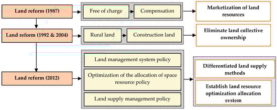 In the past 40 years, Shenzhen has carried out three land reforms. The first time was in 1987, when land leasing was changed from free charge to compensation, pioneering the marketization of land resources [22]. Shenzhen publicly auctioned the first piece of state-owned land use right, realized the separation of state-owned land ownership and use rights, and formulated a new system for the land allocation by market-oriented approaches, which directly promoted the revision of the Constitution in 1988 and improved the formation of the national market for land use right.