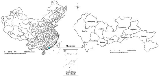 There are nine administrative districts, including Bao’an District (BA), Futian District (FT), Guangming District (GM), Longgang District (LG), Longhua District (LHA), Luohu District (LH), Nanshan District (NS), Pingshan District (PS), and Yantian District (YT), and a new district, Dapeng New District (DP), in Shenzhen. The districts are classified into center, urban peripheral, and suburban districts according to the Comprehensive Plan of Shenzhen City (2007–2020). The center districts are NS, LH, FT, and YT, the urban peripheral districts are BA, LHA, and LG, and the suburban districts are GM, PS, and DA. The location of Shenzhen and the districts in Shenzhen are presented in Figure 3.