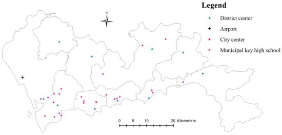 In Figure 5, the city center is Shenzhen Citizen Center, the district center is the government of each district, and the airport is Shenzhen Bao’an International Airport. There are 23 municipal key high schools confirmed by Shenzhen Education Bureau, and most schools are located in the NS, LH, and FT districts.