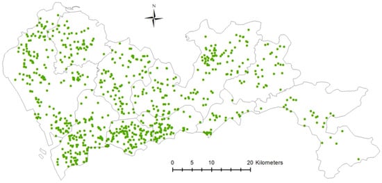 As shown in Figure 7, there are 849 parks in Shenzhen, and in general, the distribution of the parks is relatively evenly on the district level. There are a large number of parks in the LG, BA, and NS districts. In addition, the parks in the center districts are more densely concentrated.