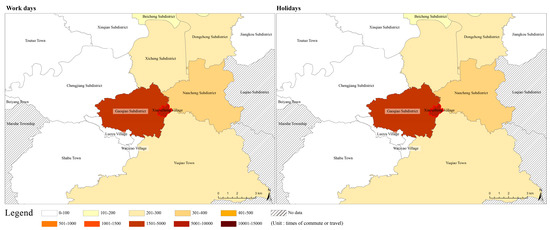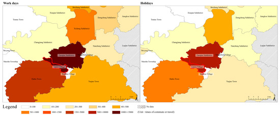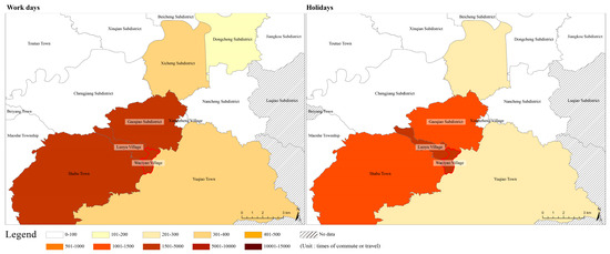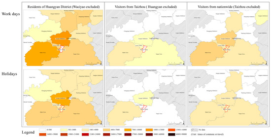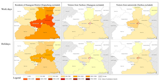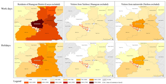 The travel patterns of Luoyu show that most residents who lived in Luoyu also worked in the village and spent their holidays there, with some residents also travelling to the Gaoqiao Subdistrict for work and leisure (Figure 7). According to an origin-to-destination analysis of residents living in Luoyu, Gaoqiao was the second most popular destination for residents of Luoyu. Luoyu showed a certain level of attraction to people living outside the village; comparatively, there were some residents in Huangyan and Taizhou who visited Luoyu on work days, whilst more visitors from outside of Taizhou visited the village on work days (see first row of Figure 8). Patterns during holidays were similar (see second row of Figure 8): there were few residents in Luoyu from Huangyan, particularly Taizhou; however, people passed by or visited the village during holidays.