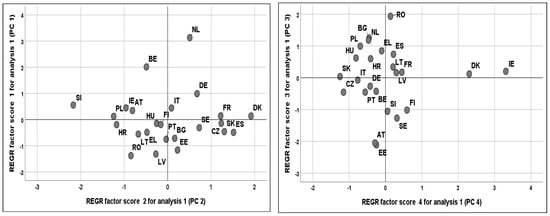 The fourth principal component (PC4) explains 9.570% of the total variance and is strongly positively correlated with Ienv3—share of agriculture in emissions of greenhouse gases (0.924) and Ieco6— government budget allocations for R&D (GBARD) for agriculture (0.712). Therefore, a high share of agriculture’s emissions of greenhouse gases require a high level of government budget allocations for R&D in agriculture. Consequently, PC4 was named the “Agricultural greenhouse gasses emissions & Public R&D investment in agriculture component.”