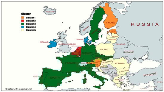 The distribution of EU-24 countries across four clusters using MapChart https://www.mapchart.net (accessed on 8 April 2024).
