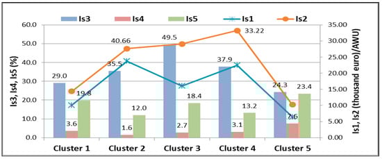 As for the social indicators, this cluster has the lowest level of agricultural incomes (Figure 5). For example, agricultural factor income (Is1) in this cluster accounted for only 27% of the average income in cluster 2 (11.02 compared with 40.66 thousand EUR/AWU). Additionally, agricultural entrepreneurial income (Is2) (10.26 compared with 33.22 thousand EUR/AWU) is more than three times lower than income achieved by countries in cluster 4 (the best performer as regards Is2). The lowest level of income is correlated with the lowest share of salaried labor input in total labor force input (24.3%) as well as with the highest level of in-work at-risk-of-poverty rate among self-employed persons (23.4%).