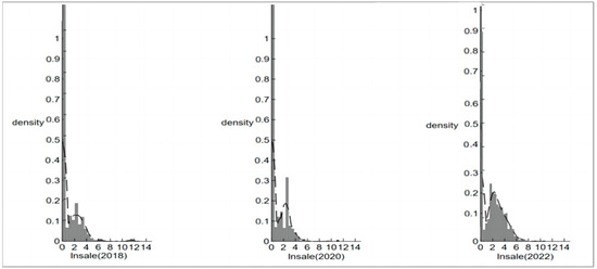 After a decade of evolution, the focus of building model cooperatives has shifted from merely enhancing individual cooperatives’ demonstration capabilities to bolstering the service capacity that benefits farmers and other core entities, as well as amplifying the model’s role in driving the overall standardization and development of the cooperative sector. Figure 1 shows the probability density of cooperative sales in a city in Guizhou Province, China, in 2018, 2020, and 2022. The right-biased trend indicates that most cooperatives have sales concentrated at lower levels, with a minority achieving higher sales volumes. A concentration of sales figures at zero for numerous cooperatives indicates a prevalence of shell cooperatives within the group. However, the right-biased trend of the probability density of cooperative sales gradually decreases, indicating that the probability of cooperatives becoming empty shells decreased.