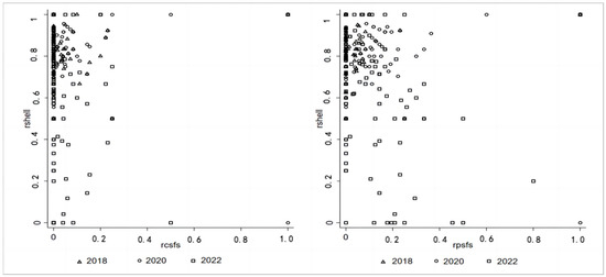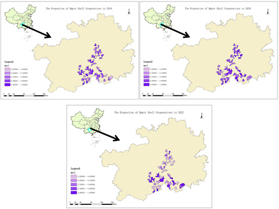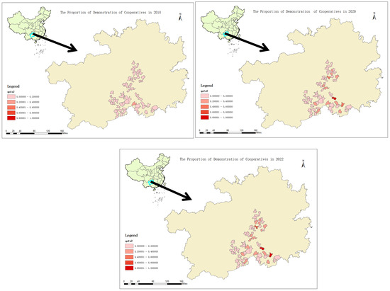 Figure 4 illustrates that from 2018 to 2022, the proportion of demonstration cooperatives in townships in a particular city in Guizhou, China, increased yearly, and the proportion of demonstration cooperatives in the southeast increased relatively. Compared with Figure 3 and Figure 4, it can be found that the implementation of the policy of demonstration cooperatives can generally inhibit the intensification of the “empty shell” of cooperatives to a certain extent. Still, to a certain extent, there is also a double-high trend in the high rate of empty shells and high demonstration cooperatives in some townships.